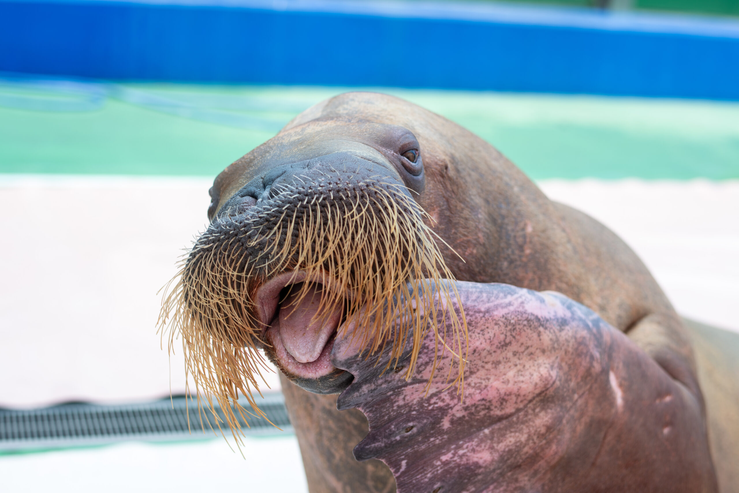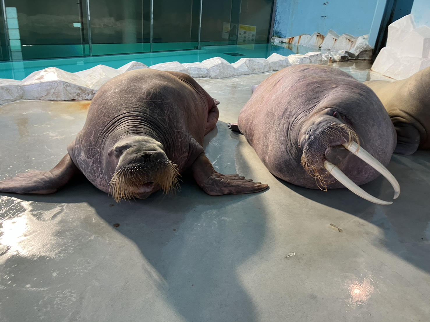セイウチたちのお食事タイムでは運が良ければおひげや牙にタッチできることも。