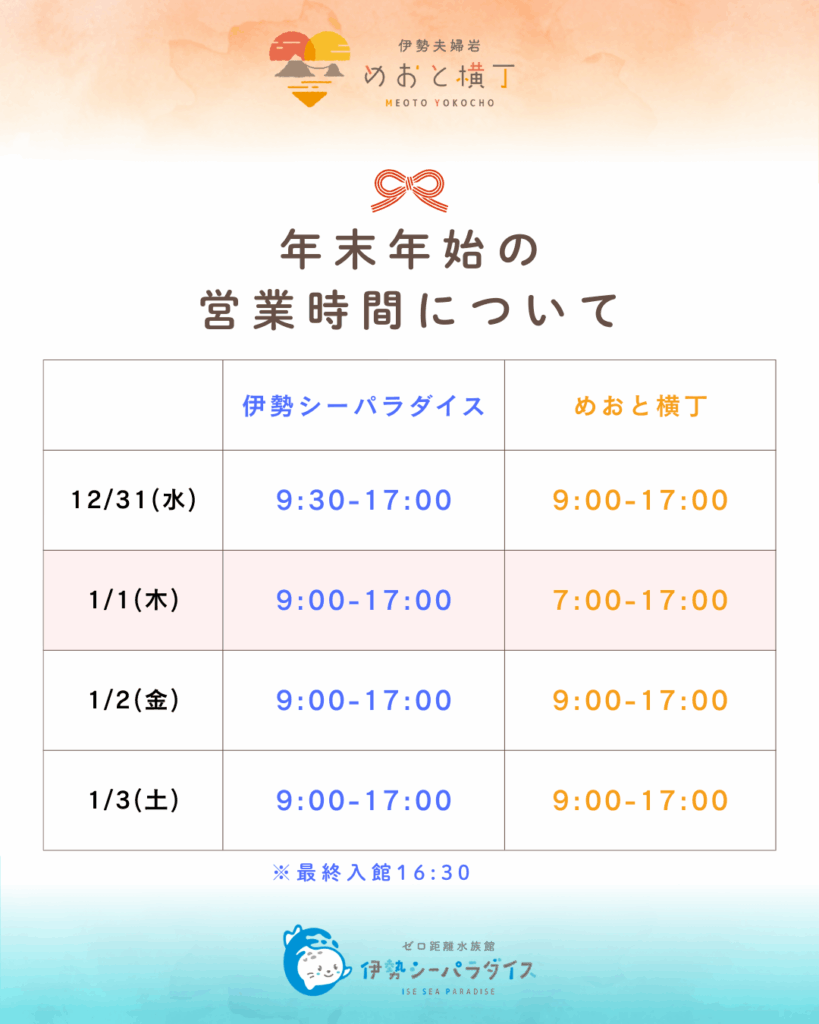 ※「めおと横丁」は元旦7:00より営業しておりますが、「伊勢シーパラダイス」は9:00オープンとなりますのでご注意ください。